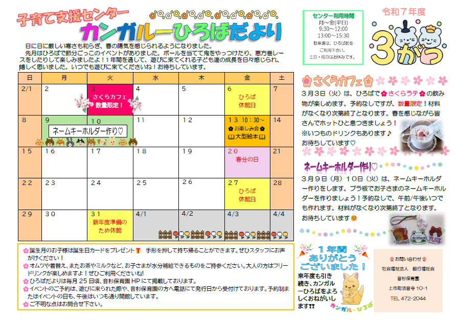 カンガルーひろば 3月号☆ 2026年2月26日 カンガルーひろば3月号をアップしました。 3月は予約制のイベントはありませんが、『さくらカフェ』『ネームキーホルダー作り』は数量限定となります。 ぜひ、遊びに来てくださいね! お待ちしています。