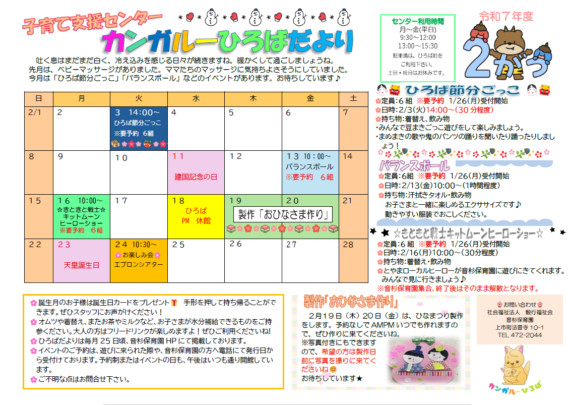 カンガルーひろばだより 2月号☆ 2026年1月26日 カンガルーひろばだより2月号です。 2月のイベントは「ひろば節分ごっこ」「バランスボール」「きときと戦士キットムーンヒーローショー」のイベントがあります。 予約制となっておりますので、ご連絡お待ちしています。 毎月行っている「お楽しみ会」「製作」は予約なしで楽しめます。 お待ちしています。